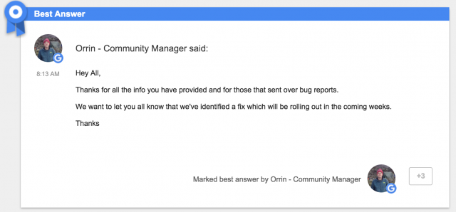 After some lengthy back and forth with those affected, a Google community manager has updated the thread to let those affected know that a fix will be rolling out soon.